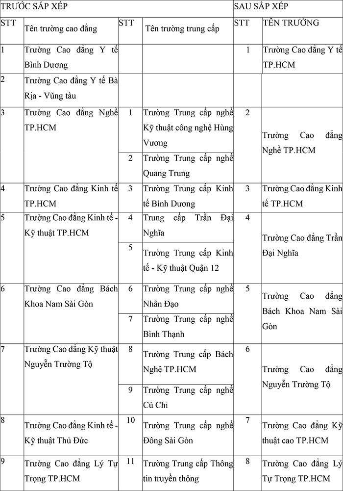 Không sắp xếp 2 trường do doanh nghiệp quản lý: Trường Trung cấp Du lịch – Khách sạn Saigontourist; Trường Trung cấp Suleco.