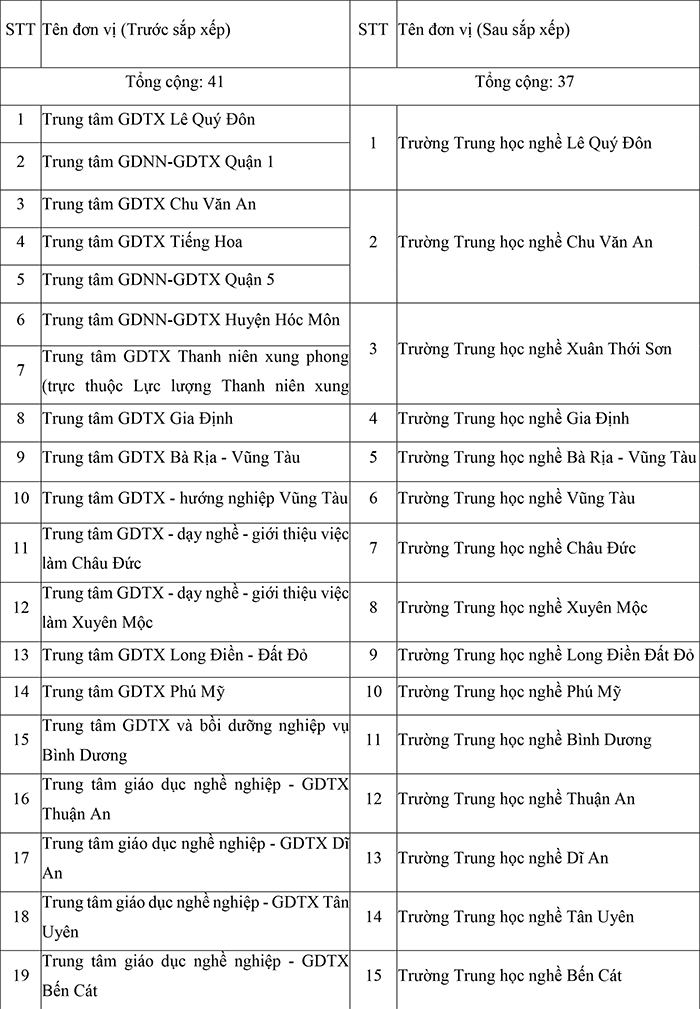 Dự kiến sau sắp xếp, TP.HCM còn 256 đơn vị sự nghiệp công lập (không tính 2 trường trung cấp do doanh nghiệp quản lý), gồm 236 đơn vị sự nghiệp công lập trực thuộc Sở GD-ĐT; 3 trường đại học, 17 trường cao đẳng trực thuộc UBND TP. Bên cạnh đó, giữ nguyên 1.930 đơn vị sự nghiệp công lập trực thuộc UBND cấp xã quản lý.