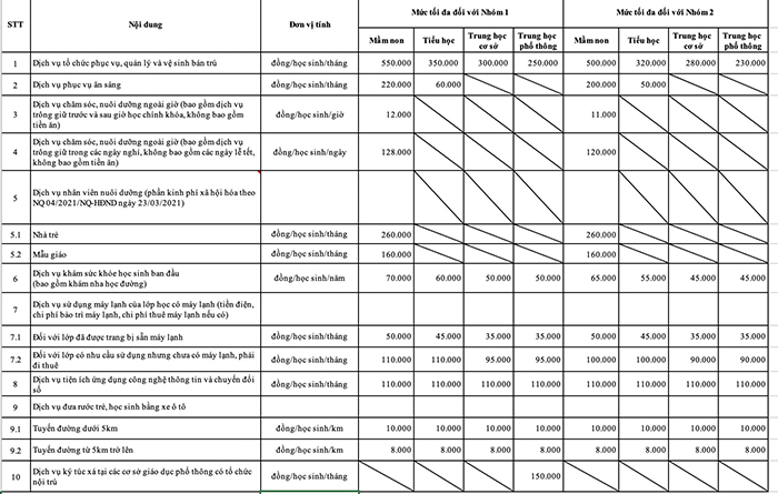 Theo dự thảo nghị quyết, các mức thu quy định tại nghị quyết là mức thu tối đa. Tùy tình hình thực tế của cơ sở giáo dục và nhu cầu của học sinh, cơ sở giáo dục thống nhất với cha mẹ học sinh mức thu cụ thể nhưng không vượt quá mức thu quy định tại nghị quyết này và không được cao hơn 15% so với năm học liền kề trước đó.