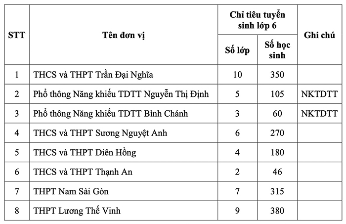 Riêng tuyển sinh lớp 6 vào các trường THCS và THPT Sương Nguyệt Anh (quận 10); THCS và THPT Diên Hồng (quận 10); THCS và THPT Thạnh An (xã đảo Thạnh An, huyện Cần Giờ) sẽ theo kế hoạch tuyển sinh của UBND quận 10 và huyện Cần Giờ.