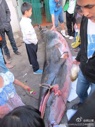 | Hình ảnh con cá voi chết được đăng trên các trang mạng Trung Quốc – Ảnh: weibo.com |