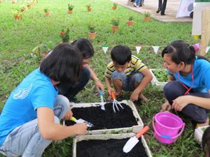 Các bạn trẻ đang trồng cây tại vườn cây của em |