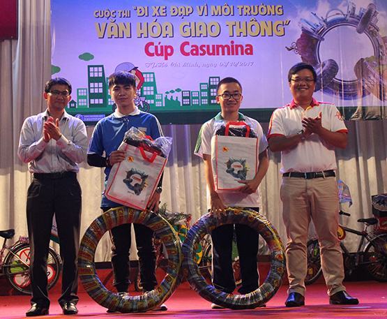 | Ông Lê Thanh Phong (bìa phải), Bí thư đoàn thanh niên Công ty Cổ phần Công nghiệp Cao su miền Nam – Casumina và ông Nguyễn Văn Gia Thụy, Phó Trưởng phòng chính trị tư tưởng Sở GD-ĐT TP.HCM trao giải nhì cho các đơn vị |