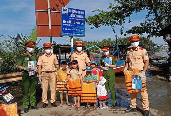 Chi đoàn Phòng CSGT đường thủy Công an TP.HCM trao tặng áo phao cho thiếu nhi tại bến đò ngang thuộc xã Phước Lộc