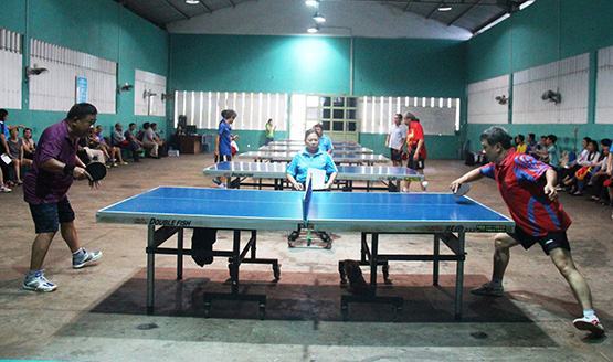 Thầy Thái Quang Cường, Hiệu trưởng THPT Nguyễn Hữu Thọ (bên trái) thi đấu môn bóng bàn với những pha đánh bóng điêu luyện