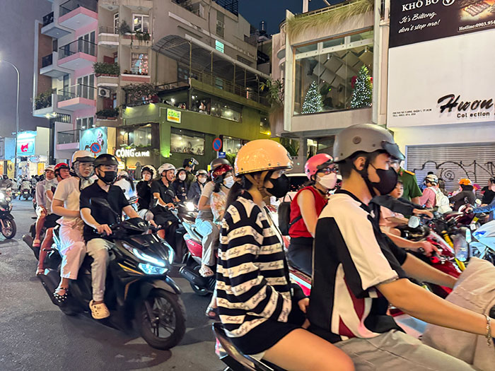 Theo ghi nhận của phóng viên, từ khoảng 18 giờ, dòng người bắt đầu dồn về các tuyến đường như Đồng Khởi, Lê Duẩn, Lê Lợi, Pasteur, Hai Bà Trưng và khu vực quanh Nhà thờ Đức Bà Sài Gòn – Bưu điện TP.HCM. Càng về tối, lượng người và phương tiện càng tăng, giao thông di chuyển chậm, có thời điểm gần như đứng yên tại một số nút giao.