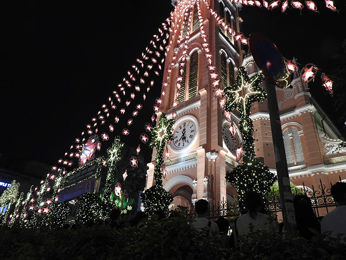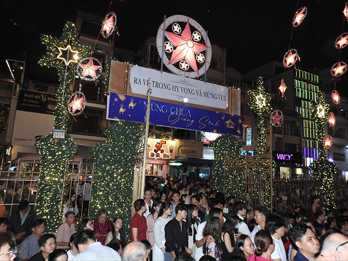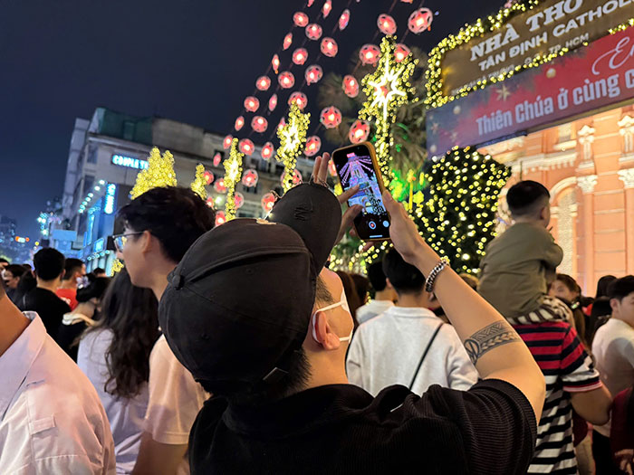 Khu vực Nhà thờ Đức Bà Sài Gòn chật kín người dân và du khách. Nhiều nhóm phải len lỏi từng bước để di chuyển, tranh thủ chụp ảnh lưu niệm dưới ánh đèn Giáng sinh. Tương tự, Nhà thờ Tân Định cũng thu hút đông đảo người dân đến tham quan, chụp ảnh và vui chơi, tạo nên khung cảnh nhộn nhịp kéo dài đến khuya.