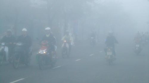 | Do sương mù dày đặc nên nhiều xe phải bật đèn – Ảnh Võ Trường chụp lúc 7 giờ ngày 3-1 |