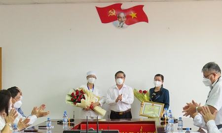 Ông Trần Việt Trường, Chủ tịch UBND TP.Cần Thơ (đứng giữa), trao Bằng khen và hoa cho Khoa ICU và BS.CKII Phan Thị Phụng