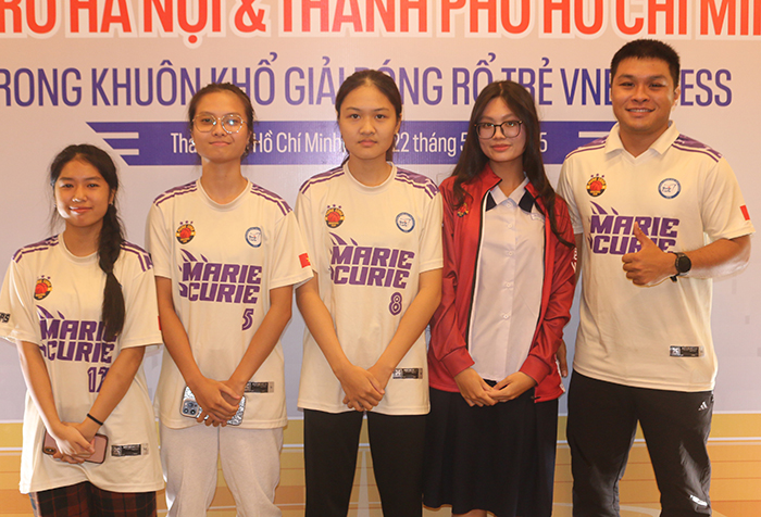 Em Phan Minh Ngọc (thứ 2, từ trái sang) cùng các bạn trong đội bóng rổ