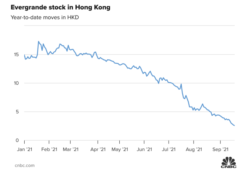 Giá cổ phiếu Evergrande ở Hồng Kông trong giai đoạn 21-1 đến 21-9. Ảnh: CNBC