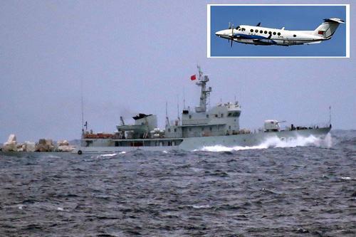 Máy bay tuần thám biển CMS B-3586 (ảnh nhỏ), tàu quét mìn tham gia hộ tống giàn khoan trái phép Hải Dương-981 – Ảnh: Độc Lập