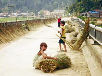 | Nhiều học sinh Quảng Ngãi nghỉ học giúp bố mẹ thu hoạch đót. Ảnh: Phú Đức |