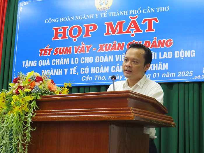 Phát biểu tại buổi họp mặt, PGS.TS. Hoàng Quốc Cường – Bí thư Đảng ủy, Giám đốc Sở Y Tế TP. Cần Thơ khái quát một số thành tựu nổi bật của ngành y tế TP năm 2024 và khẳng định: Trong thành quả đó có sự đóng góp quan trọng của CĐN Y tế: “Thời gian qua Công đoàn đã thể hiện được vai trò của mình sâu sát, nắm bắt tâm tư nguyện vọng, kịp thời động viên, tháo gỡ những khó khăn giúp công chức, viên chức, người lao động (CCVCNLĐ) dần thích nghi và yên tâm công tác, cống hiến cho ngành, nghề. Đặc biệt dịp Tết đến xuân về, tổ chức được nhiều hoạt động chăm lo như: Thăm tặng quà Tết, phiên chợ không đồng, bán hàng giảm giá; mua sắm online trên sàn giao dịch thương mại điện tử; Hỗ trợ mái ấm công đoàn… đã giúp cho NLĐ giảm bớt khó khăn dịp Tết.