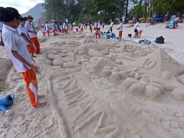 Các bạn sinh viên Thái Lan tạo dựng tác phẩm điêu khắc bằng cát tưởng niệm nạn nhân thảm họa động đất sóng thần trên bãi biển Patong, Phuket. (Nguồn: AFP/TTXVN)