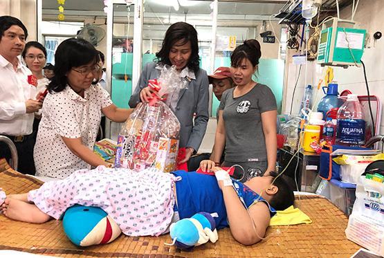 Cùng ngày, đoàn cũng đã đến thăm hỏi, tặng 200 phần quà cho các bệnh nhi có hoàn cảnh khó khăn đang điều trị tại BV Nhi đồng 1; 200 phần quà cho các bệnh nhi tại BV Nhi đồng 2; 100 phần quà cho các bệnh nhân tại BV An Bình.