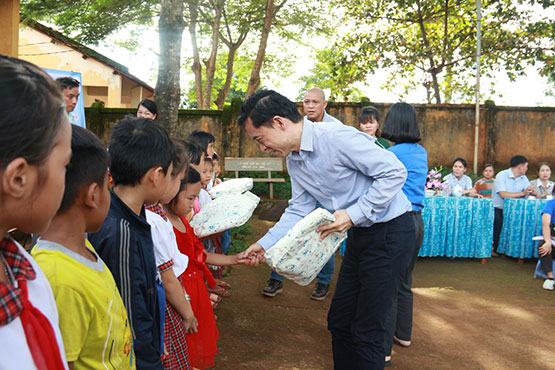 Trưởng đoàn đại biểu thanh niên Việt – Nhật, Giáo sư Akimori Seki – Chủ tịch Hiệp hội Giáo dục và Giao lưu châu Á trao quà cho thiếu nhi vùng biên