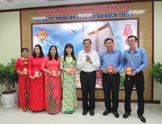 Ông Phạm Văn Hiểu, Phó Bí thư thường trực Thành ủy, Chủ tịch HĐND TP Cần Thơ, trao quà tết cho các nhân viên tiêu biểu của Cty Xổ số kiến thiết Cần Thơ