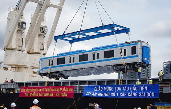 Đoàn tàu đầu tiên trong tổng số 17 đoàn tàu được sản xuất cho tuyến đường sắt Metro số 1 từ Nhật Bản về TP.HCM