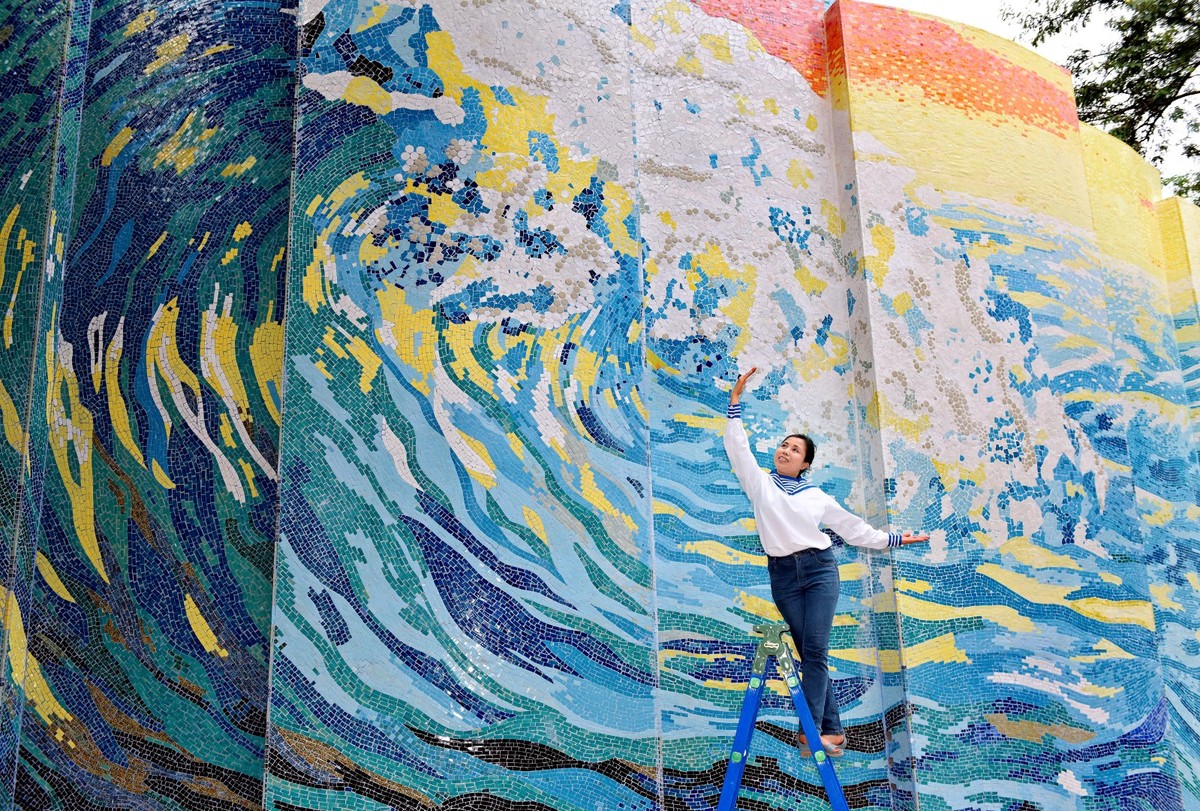 Nữ họa sĩ tâm sự: “Từ Biển Hạ Long đến Sóng Trường Sa – đó là chủ đề ý tưởng tôi thiết kế trang trí cho mặt ngoài tòa nhà Gương. Với tất cả tình cảm yêu quý và những kỷ niệm gắn bó với biển Hạ Long – di sản thiến nhiên của Thế giới và 5 chuyến đi công tác ở Trường Sa để thi công các công trình gắn gốm góp phần khẳng định chủ quyền biển đảo Việt Nam tôi đã gửi gắm tất cả trong công trình giữa trung tâm Thủ đô Hà Nội.”
