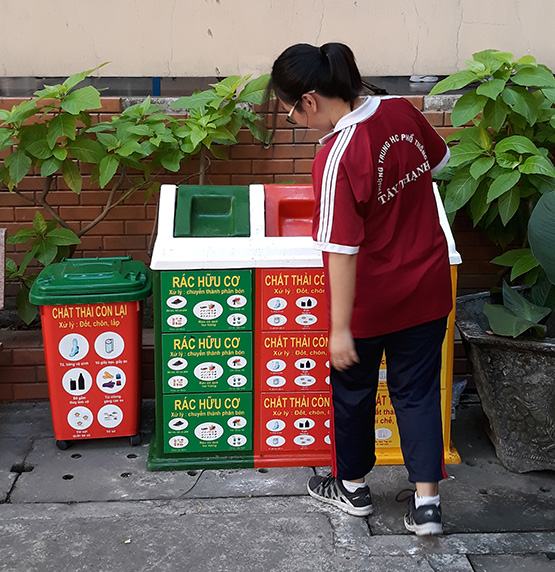 Trong nhà trường, để giáo dục học sinh việc xả rác không nên chỉ dừng lại ở sự răn đe, các hình phạt, mà cần chú trọng ở cách tạo điều kiện thuận lợi để các em bỏ rác đúng nơi đúng chỗ. Ý thức được điều đó và để hưởng ứng cuộc vận động của TP.HCM “Người dân thành phố không xả rác ra đường và kênh rạch, vì thành phố sạch, giảm ngập nước”, trong đó có việc phân loại rác thải từ đầu nguồn, vừa qua, Trường THPT Tây Thạnh có một cách làm rất cụ thể và hiệu quả. Đó là, sau khi thông qua kế hoạch thực hiện, nhà trường đã đặt hàng nhà sản xuất các thùng rác khá lớn và bắt mắt. Các thùng rác “không đụng hàng” này gồm 3 màu xanh, đỏ, vàng khác nhau, có ghi chú rõ bên ngoài và có hình minh họa để cho học sinh tiện lợi sử dụng, gồm: rác hữu cơ, rác thải tái chế và rác thải còn lại. Chia sẻ ý tưởng này, thầy Nguyễn Quang Đạt (Hiệu trưởng nhà trường) cho biết: “Hơn cả việc xả rác, đó là thói quen, hành vi, là văn hóa. Qua cuộc vận động này, chúng tôi muốn giáo dục các em sự gọn gàng, ngăn nắp, thói quen của nếp sống văn minh…”.