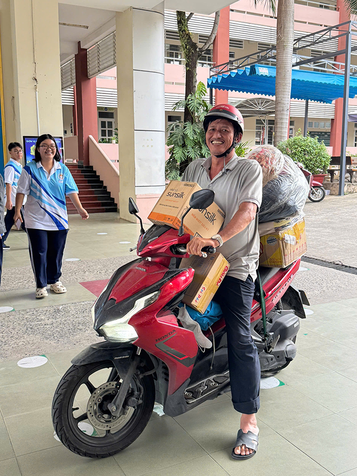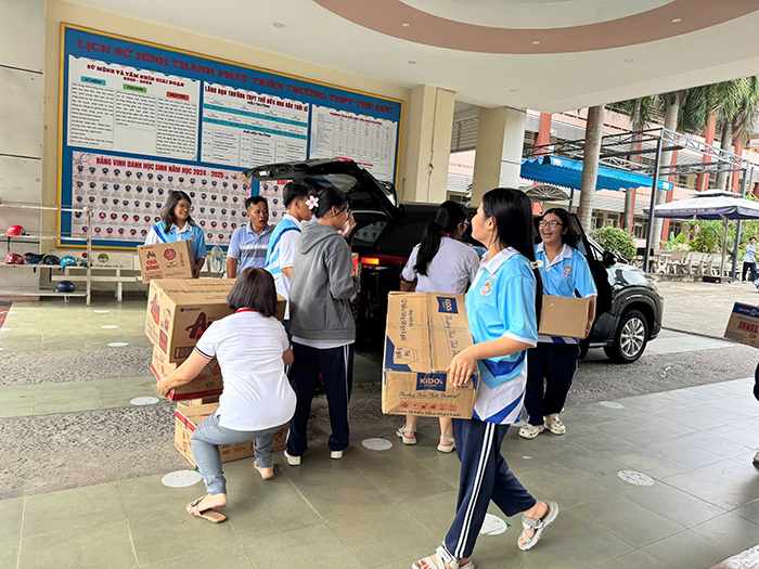 Buổi học sáng 24-11 của học sinh Trường THPT Thủ Đức, phường Thủ Đức, TP.HCM đặc biệt hơn khi các em đến trường ngoài sách tập còn là những thùng mì tôm, nước uống, gạo và cả những bọc quần áo cũ đã được giặt sạch, là ủi thơm tho…, để hưởng ứng lời kêu gọi của nhà trường hỗ trợ đồng bào miền Trung đang chịu nhiều ảnh hưởng của thiên tai, lũ lụt.