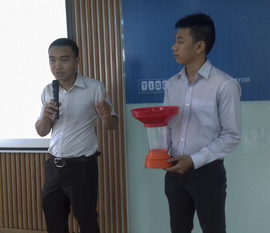 | Nhóm sinh viên đang trình bày ý tưởng tại cuộc thi ngày 21-4 |