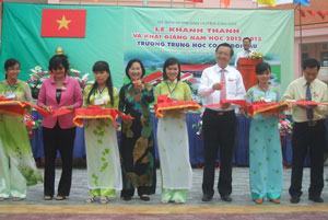 Bà Trương Thị Ánh, Phó chủ tịch HĐND TP và ông Lê Hồng Sơn, Giám đốc Sở GD-ĐT TP.HCM cùng lãnh đạo huyện và BGH cắt băng khánh thành