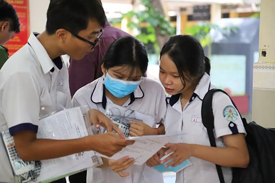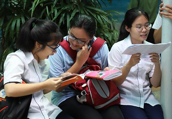Thí sinh tranh thủ ôn bài và làm thủ tục trước thi môn toán tại điểm thi Trường THCS Ba Đình, TP.HCM
