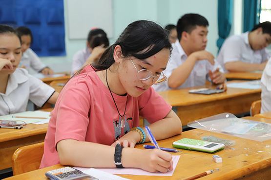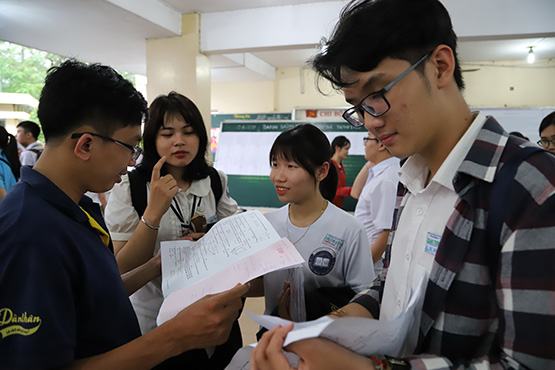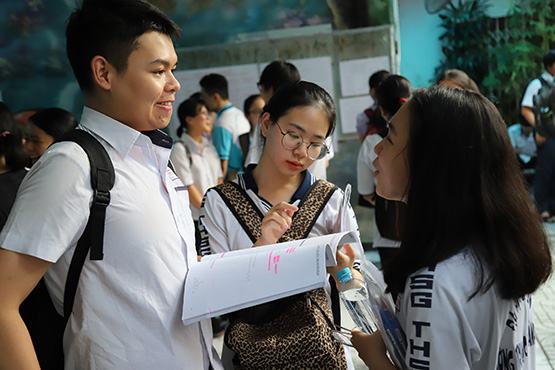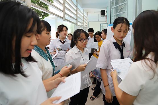 Thí sinh làm thủ tục trước giờ thi môn ngữ văn tại điểm thi trường THPT Marie Curie, TPHCM