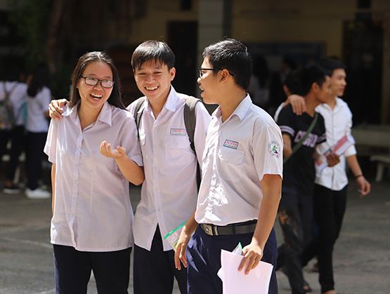Thí sinh vui vẻ ra về sau khi thi xong môn toán tại điểm thi trường THPT Hùng Vương, TPHCM