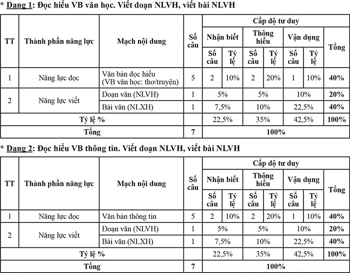 Đề thi minh họa môn ngữ văn cho kỳ thi tốt nghiệp THPT năm 2025 được Bộ GD-ĐT công bố 2 lần. Học sinh lưu ý ở đề thi lần 2, vì có điều chỉnh. Chú ý đề có sự thay đổi linh hoạt trong cách yêu cầu. Điều này thể hiện rõ trong ma trận Bộ GD-ĐT công bố kèm theo với đề minh họa. Theo đó, có 2 dạng sau đây: Dạng 1, nếu ở phần đọc hiểu là văn bản văn học (chủ yếu là thơ, truyện), thì câu viết đoạn văn là nghị luận văn học và câu viết bài văn là nghị luận xã hội. Dạng 2, nếu ở phần đọc hiểu là văn bản thông tin/nghị luận, thì câu viết đoạn văn là nghị luận xã hội và câu viết bài văn là nghị luận văn học. Xem ma trận đề thi thử của một trường THPT tại TP.HCM dưới đây:
