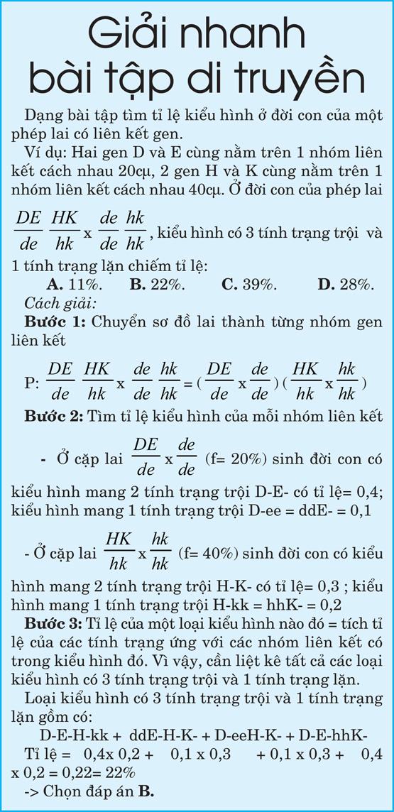 Tóm lại, năm học chúng tôi cho HS lớp 12 làm nhiều bài tập hơn các năm trước để giúp khắc sâu và vận dụng kiến thức, cách phân bổ thời gian làm bài thi hợp lý; hướng dẫn các em nhận diện những “từ khóa” của đề bài. Rèn năng lực nhận dạng đề từ đó chọn cách giải thích hợp. Thí dụ với Bài tập cơ sở vật chất di truyền và biến dị: Đây là các bài tập thuộc khoa học chính xác như toán, lý, hóa; HS phải nắm được công thức mới giải được, cụ thể: Số nu môi trường cần cung cấp cho 1 gen có 3000 nu nhân đôi 3 lần = (23 – 1) 3000.