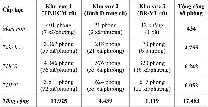 Theo báo cáo, TP.HCM hiện cần bổ sung thêm 17.483 phòng học các cấp học từ mầm non đến THPT ở cả 3 khu vực. Trong đó, nhiều nhất là khu vực 1 cần bổ sung thêm 11.925 phòng học; khu vực 2 cần bổ sung thêm 4.439 phòng học; khu vực 3 với nhu cầu bổ sung là 1.119 phòng học.