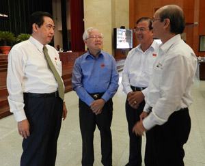 Chủ tịch UBND TP Lê Hoàng Quân (thứ hai từ trái sang) trao đổi với các đại biểu HĐND trong giờ giải lao