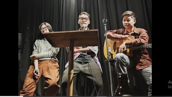 Nhà thơ trẻ Nam Thi (giữa) trong một chương trình giao lưu thơ với bạn đọc Hà Nội vào tháng 4-2021