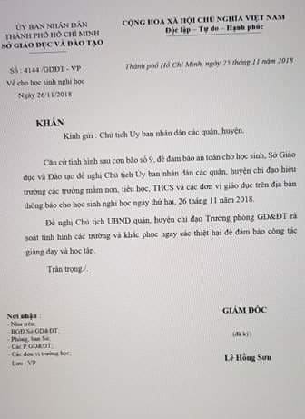 Vào 20 giờ tối nay, Sở GD-ĐT TP.HCM đã phát đi thông báo: học sinh tất cả các cấp học, bậc học trên địa bàn TP sẽ nghỉ học cả sáng và chiều ngày 26-11. Do bão số 9 suy yếu thành áp thấp nhiệt đới khiến chiều 25-11 ở TP.HCM mưa rất to trên diện rộng. Hàng loạt tuyến đường trên địa bàn TP ngập nước, cây xanh bật gốc, nhiều khu vực trên địa bàn TP đã bị ngập sâu, học sinh sẽ gặp khó khăn trên đường đến trường.