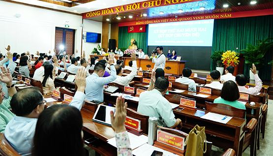 Các đại biểu biểu quyết thông qua nghị quyết về đề nghị công nhận xã Thạnh An, huyện Cần Giờ là xã đảo. Ảnh: N.Tr