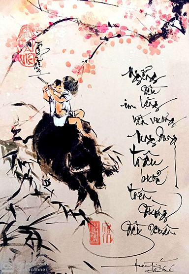 Những bức thư họa với những vần thơ mộc mạc, trữ tình, biểu cảm kết hợp cùng hình ảnh những chú trâu hiền lành, dễ mến cùng cành mai vàng ung dung bước giữa trời đầy xuân, gửi gắm ước mơ một cuộc sống an bình, sung túc, như: