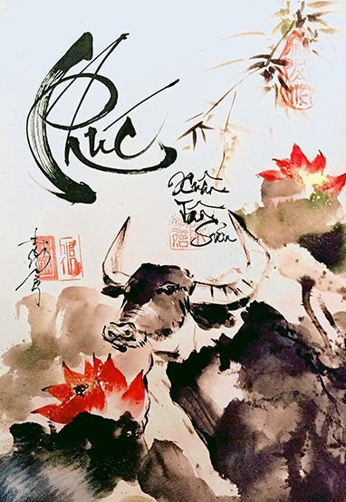 Hình 4: Vẽ chú trâu hòa mình vào những hoa sen đỏ thắm, cảm giác yên bình, bên chữ Phúc, thể hiện năm mới bình an và hạnh phúc.