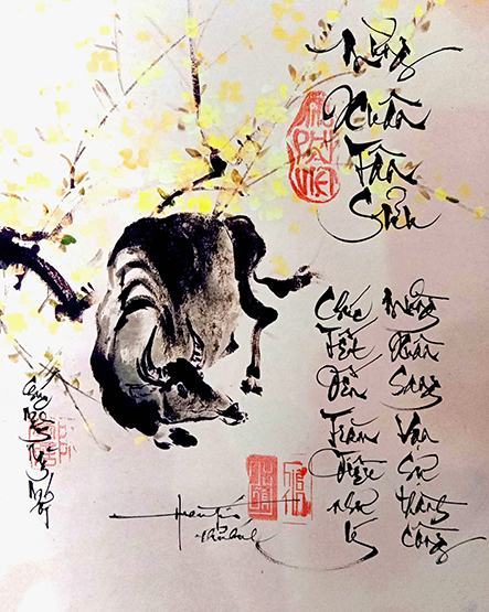 Hình 5: Vẽ chú trâu đang vui mừng dưới cội mai vàng như biết mình đăng cai trong năm Tân Sửu với câu đối: “Chúc Tết đến trăm điều như ý. Mừng xuân sang vạn sự thành công”.