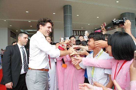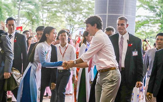 Thủ tướng Justin Trudeau đã chia sẻ với các sinh viên thông tin về mối quan hệ giữa hai nước Việt Nam và Canada, bày tỏ tin tưởng hai nước sẽ tiến xa hơn bằng cách hỗ trợ lẫn nhau. Theo Thủ tướng, hai nước Việt Nam và Canada đang trở thành những đối tác thân thiết, trong đó, giáo dục là nội dung rất quan trọng. Ông khích lệ sinh viên suy nghĩ, hành động, học tập để xây dựng đất nước và xây dựng thế giới, cho rằng nỗ lực của các em hiện nay sẽ mang đến nhiều lợi ích mà các em chưa nghĩ tới.