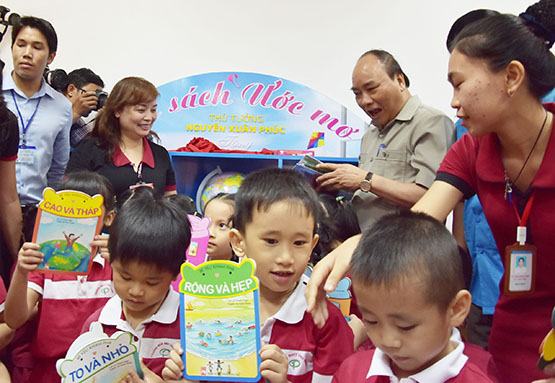 | Thủ tướng Nguyễn Xuân Phúc tặng sách cho các cháu tại Trường Mầm non Thái Quang. Ảnh: H.C |