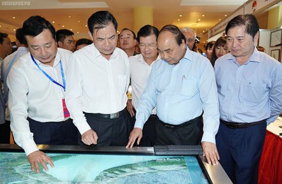 Thủ tướng Nguyễn Xuân Phúc tham quan Triển lãm công nghệ phòng chống thiên tai. Ảnh: VGP