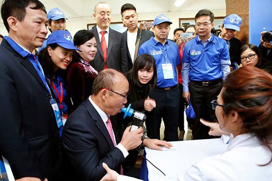 Tại điểm cầu Hà Nội HLV Park Han Seo được kiểm tra sức khỏe tại chương trình. Ảnh: L.N