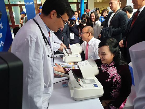 Bộ trưởng Bộ Y tế Nguyễn Thị Kim Tiến kiểm tra sức khỏe tại chương trình. Ảnh: L.N