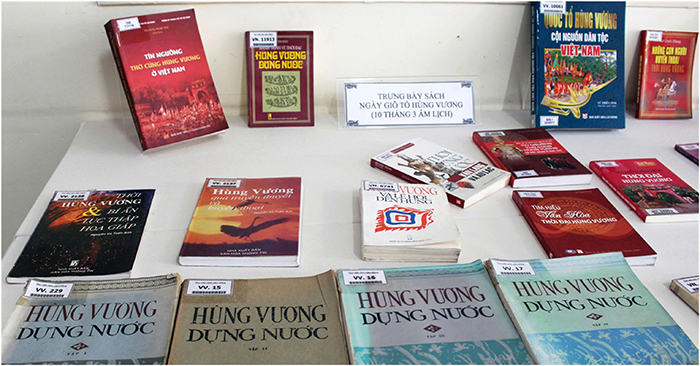 Một số đầu sách có giá trị được trưng bày như: Truyền thuyết Hùng Vương, Hùng Vương qua truyền thuyết và huyền thoại, Thời đại Hùng Vương, Hành trình về thời đại Hùng Vương dựng nước, giữ nước, Hùng Vương dựng nước (4 tập), Nhìn về thời đại Hùng Vương, Tìm hiểu văn hóa thời đại Hùng Vương, Thời dựng nước Văn Lang và Âu Lạc, Hà Nội thời Hùng Vương – An Dương Vương…