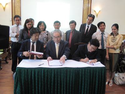 Phó Chủ tịch UBND tỉnh Thừa Thiên – Huế , ông Ngô Hòa (ngồi, bên phải) ký kết với Tập đoàn Aeon dự án 3 triệu USD đầu tư xây dựng 30 trường học.