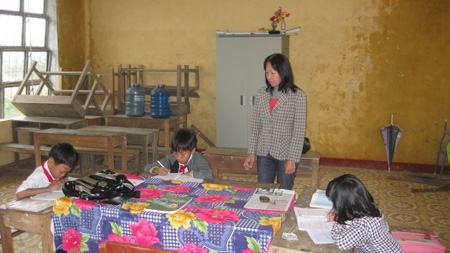 Khi chúng tôi đến chỉ có 4 lớp đang học gồm lớp 1, 2, 3 và 4. Trường có 3 giáo viên cùng 16 em HS. Vì vậy không khí náo động của giờ ra chơi dường như không có ở đây. Lớp chỉ có vài ba học trò nên cô giáo gộp bàn học giống như dạy kèm.
