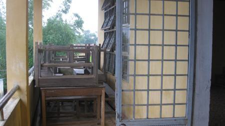 Tại Trường tiểu học thôn Triêm Tây, bàn ghế dư thừa nên chất thành đống.